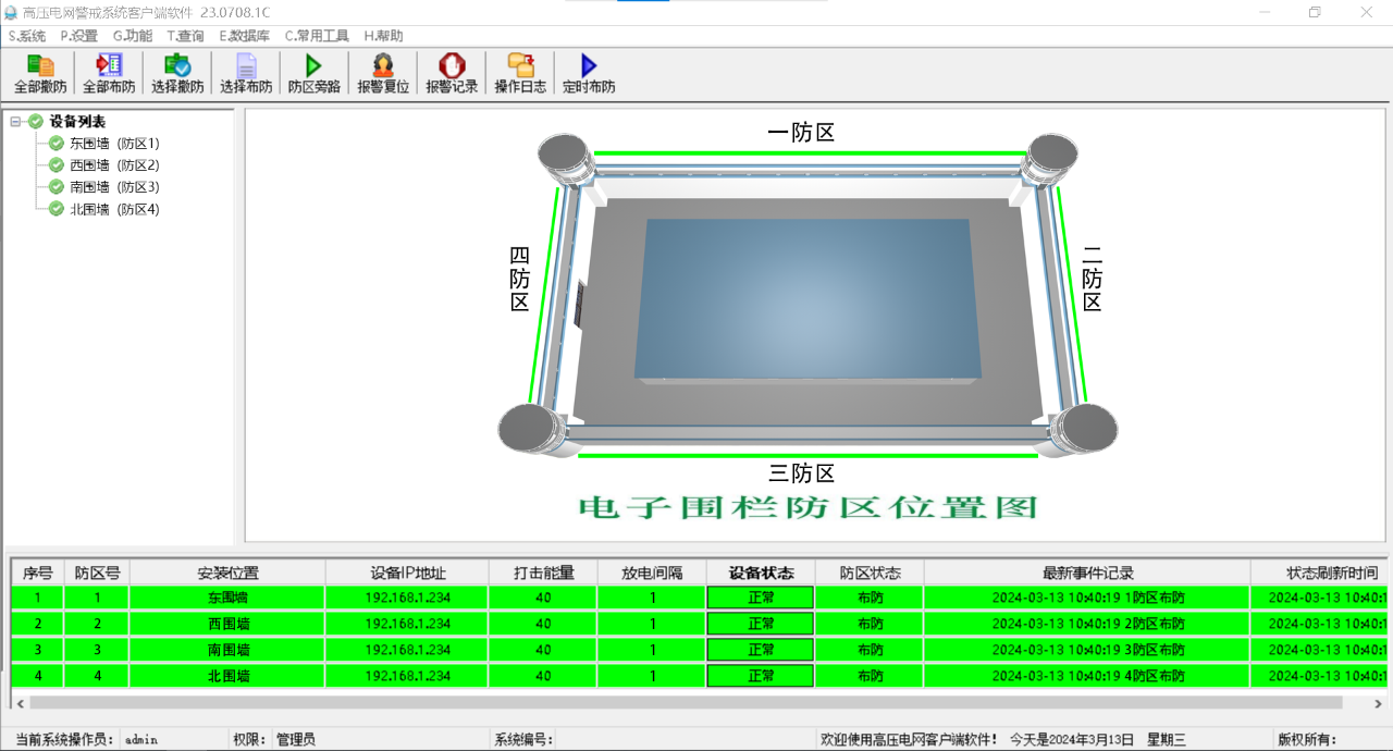 ● 功能:管理控制前端高壓電網(wǎng)主機(jī)、分控主機(jī);實時監(jiān)控前端電網(wǎng)圍欄防區(qū)狀態(tài)以及對防區(qū)參數(shù)設(shè)定;支持報警信息、軟件操作信息查詢導(dǎo)出